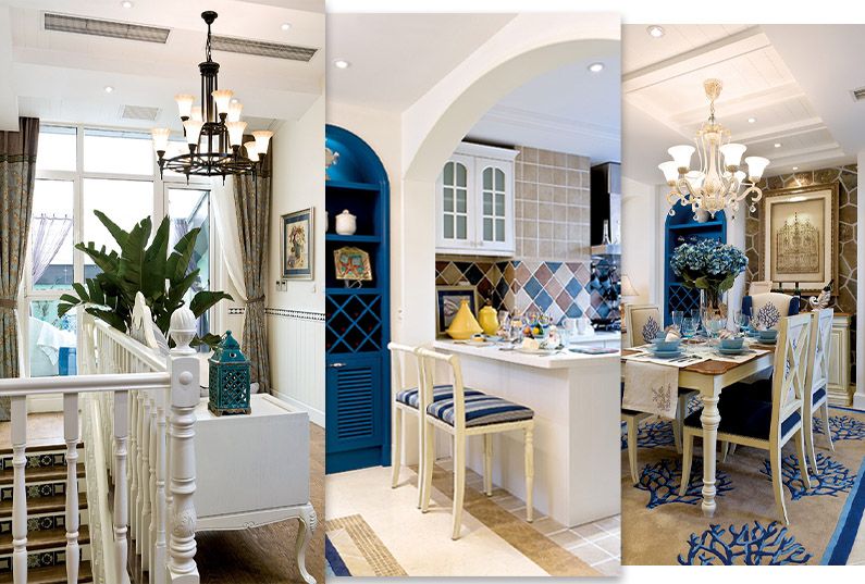 陽光般純凈的白色,讓人身心舒爽;靜謐海水般優(yōu)雅高貴的寶石蘭,讓人身、心安逸放松。生活在忙碌都市的人們,很向往無拘無束自然悠閑的生活。該案例放棄了傳統(tǒng)的審美情趣,為居住著打造一個悠閑、放松的異域風情。