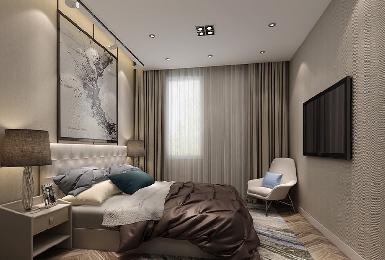 簡約俐落的質材鋪敘與敞明大方的格局尺度,是輕奢風定調的設計居宅中,不可或缺的重要元素。在案例中,陳設藝術品及金屬線條材質來營造大氣、自然、輕奢的裝飾美學氛圍。墻面、地面、家具陳設等均以簡潔的造型、精細的工藝為其特征,強調品質感和細節(jié)處理。在色彩搭配方面以暖色為主,溫馨的客桌花束、明黃色的搭毯、直觀大氣的金屬材質,帶著淡淡的隨意,隨著輕輕的希冀讓人感受到的是空間彌漫的溫馨與舒暢。
