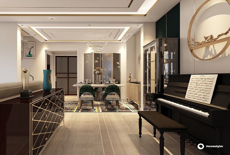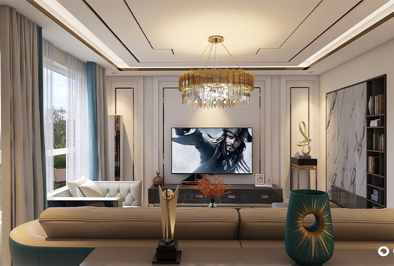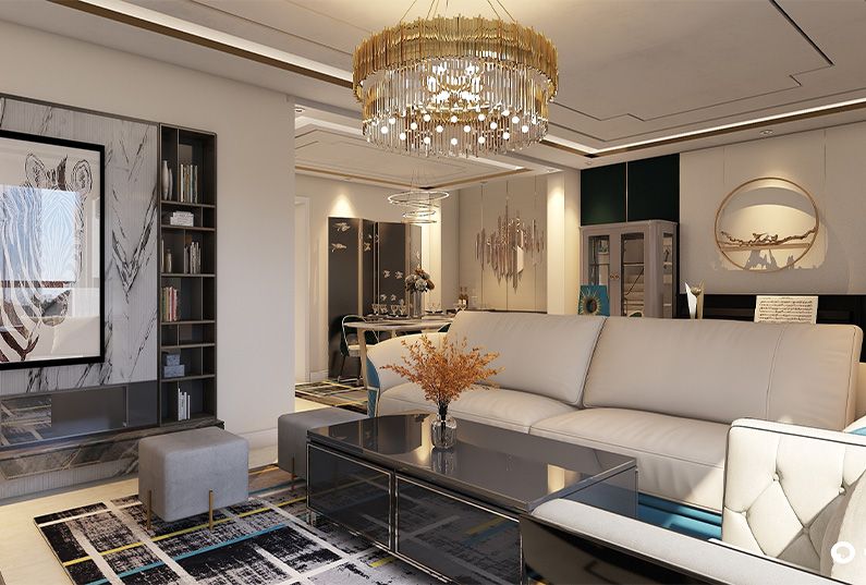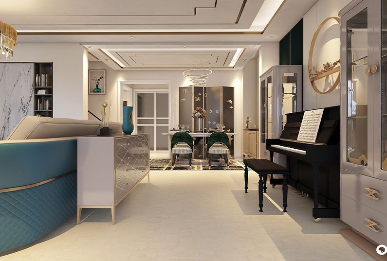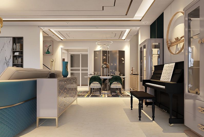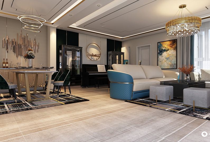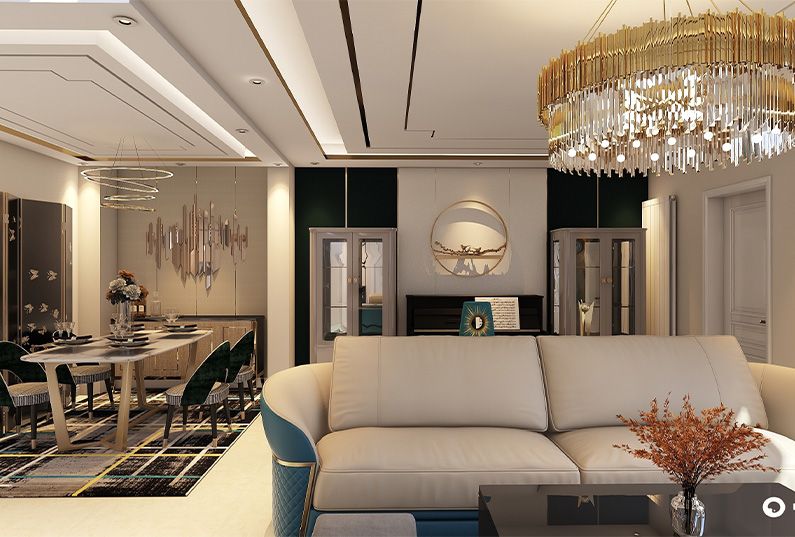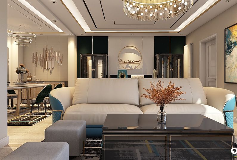 主題為現(xiàn)代輕奢風(fēng)格,簡約俐落的質(zhì)材鋪敘與敞明大方的格局尺度,是輕奢風(fēng)定調(diào)的設(shè)計居宅中,不可或缺的重要元素。在案例中,陳設(shè)藝術(shù)品及金屬線條材質(zhì)來營造大氣、自然、輕奢的裝飾美學(xué)氛圍。墻面、地面、家具陳設(shè)等均以簡潔的造型、精細(xì)的工藝為其特征,強調(diào)品質(zhì)感和細(xì)節(jié)處理。在色彩搭配方面以暖色為主,溫馨的客桌花束、明黃色的搭毯、直觀大氣的金屬材質(zhì),帶著淡淡的隨意,隨著輕輕的希冀讓人感受到的是空間彌漫的溫馨與舒暢。