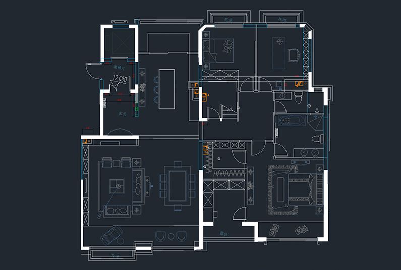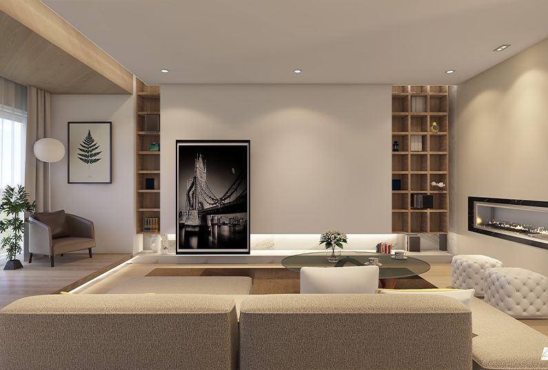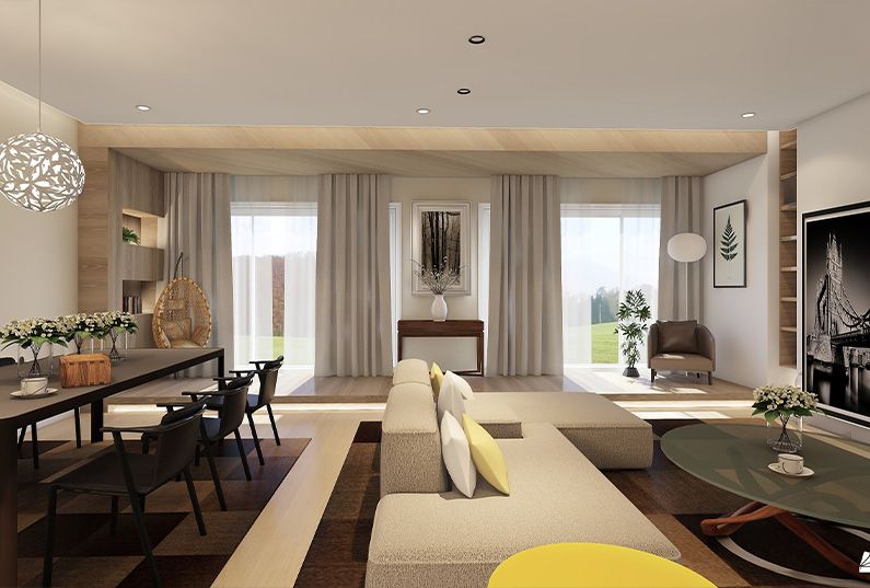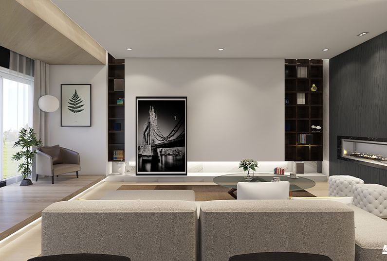 簡約俐落的質(zhì)材鋪敘與敞明大方的格局尺度,是現(xiàn)代風定調(diào)的設計居宅中,不可或缺的重要元素。在案例中,陳設藝術品及金屬線條材質(zhì)來營造大氣、自然、輕奢的裝飾美學氛圍。墻面、地面、家具陳設等均以簡潔的造型、精細的工藝為其特征,強調(diào)品質(zhì)感和細節(jié)處理。在色彩搭配方面以暖色為主,溫馨的客桌花束、明黃色的搭毯、直觀大氣的金屬材質(zhì),帶著淡淡的隨意,隨著輕輕的希冀讓人感受到的是空間彌漫的溫馨與舒暢。