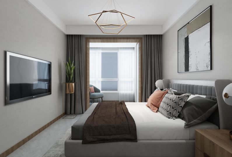 主臥室床頭背景用了灰藍(lán)的顏色,與整體白色原木色的家具搭配協(xié)調(diào),簡單的線燈,還有規(guī)則的三角形藍(lán)白灰的地毯,與床頭背景的顏色呼應(yīng),使整個(gè)空間與眾不同。