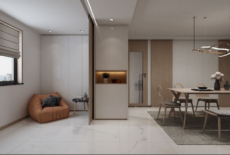 原結(jié)構(gòu)輕體墻拆除,原客廳位置增加臥室空間,隱藏門到頂,霧化玻璃分割活動區(qū)與臥室之間的私密性,原主臥室為孩子兩個孩子的休息學習娛樂的互動空間。原次臥室為老人居室和公共閱讀娛樂區(qū)。衛(wèi)生間改為兩個衛(wèi)生間??蛷d區(qū)用長桌代替?zhèn)鹘y(tǒng)沙發(fā)電視的功能。