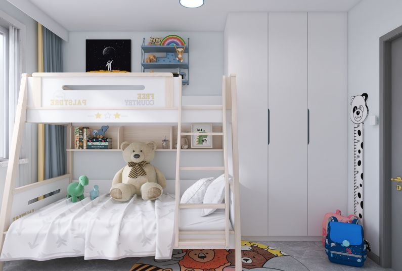 次臥為兒童房空間,全屋采用簡單的顏色跟木質(zhì)的上下鋪?zhàn)龃钆洹?/p>