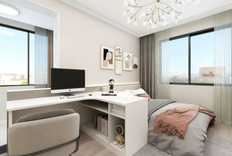 主臥簡(jiǎn)潔不失溫馨,柜子采用業(yè)主喜歡粉色點(diǎn)綴