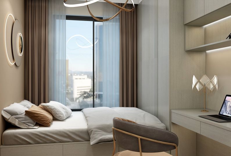 臥室的床上裝飾以舒適為主,以簡約的配飾,凸顯室內(nèi)輕奢的柔美。以人為中心,將軟裝元素與空間自然細(xì)膩的嵌入在一起,實(shí)現(xiàn)設(shè)計(jì)對體驗(yàn)的提升。