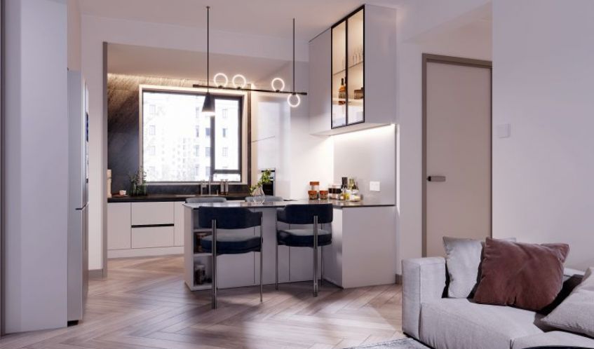 廚房外部區(qū)域?yàn)橄匆聶C(jī)與冰箱的放置區(qū),整體與煙機(jī)灶臺(tái)區(qū)用玻璃推拉門(mén)隔斷。平開(kāi)門(mén)關(guān)上便可隔離油煙。