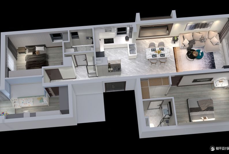 客廳門廳、餐廳及廚房的墻體改造,擴(kuò)大廚房面積,提升門廳過道通透感。墻整體調(diào)整為開放式廚房,讓采光、通風(fēng)、視覺效果提高。