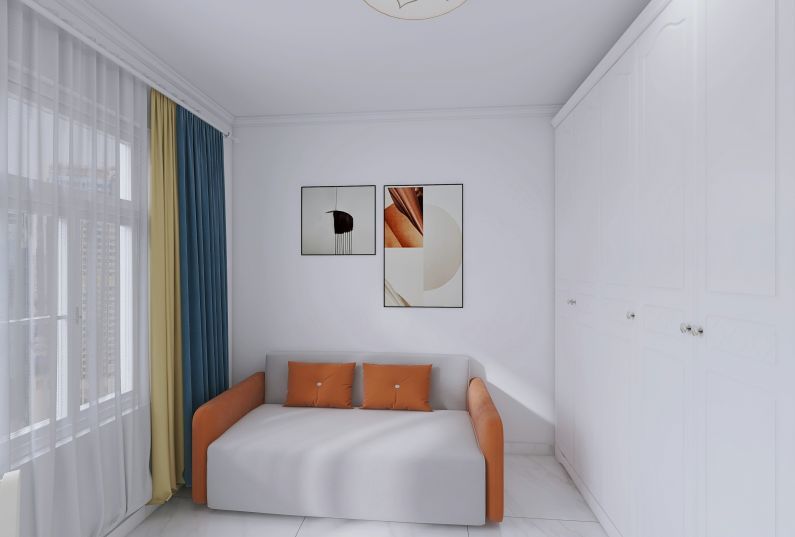 整體淺冷色系、背景色為白色為主,局部點綴橘色、藍色等亮色。使空間更加活潑、溫馨。地面采用瑞士白的大地磚,使整個空間明亮、簡潔、清爽。