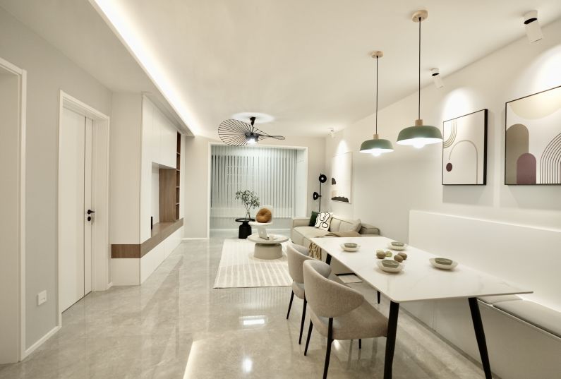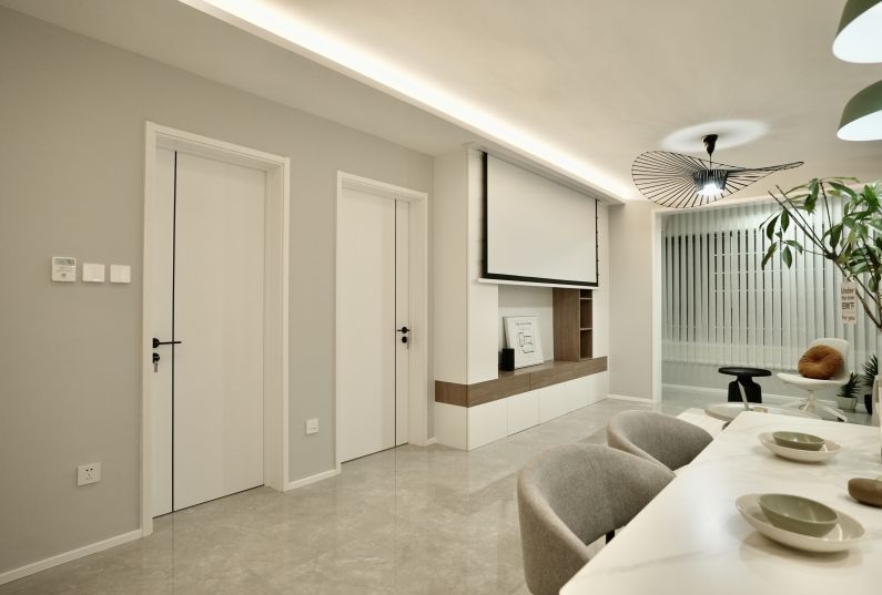 總體說明:客戶是一名攝影師,在整個(gè)空間中里面的心思和設(shè)計(jì)都是他最滿意的,令他最開心的就是現(xiàn)在這里不僅僅是自己的家,還美到能做攝影棚,幫他找到了工作和生活的平衡點(diǎn)。 門廳:白色做為空間的主色調(diào),簡(jiǎn)潔的門廳柜,出門不必思緒過多,簡(jiǎn)單的空間,紛擾的生活,在進(jìn)出門的那一刻進(jìn)行分割。客廳:在原有基礎(chǔ)上打破傳統(tǒng)布局,客餐廳融為一體,形成自由開放的通透空間,取消了客廳空間的電視功能,增加了隱藏投影功能,將需求細(xì)節(jié)化。 并在此基礎(chǔ)上做了強(qiáng)大隱形收納,將家中日?;貧w到成員間的有趣互動(dòng)中。利用簡(jiǎn)約柔和的色調(diào)和軟裝增強(qiáng)了交互的隨和性餐廳:以通透為由,來處理相鄰空間的聯(lián)動(dòng)情景。弱化空間的邊界感,增強(qiáng)了區(qū)域間的視野聯(lián)系,這里不僅是一家人的三餐之所更是傳遞溫情之處,三餐有味四季有景廚房:傳統(tǒng)的中國人的烹飪方式,還是會(huì)產(chǎn)生一些油煙的氣息,也由于空間的限制沒有做半開放式的處理,給予廚房一定的私密空間,讓談笑間??烹飪的樂趣尤為顯得自在輕松。主臥: 臥室是每個(gè)人的靜修之地,也是最長的休憩之所,深夜的晚安與清晨的陽光都,是最原始的松弛與從容簡(jiǎn)潔的顏色和布局,沉靜而溫暖。衛(wèi)生間: 生間小而整潔,將功能和形式簡(jiǎn)化至平衡,物品的線條營造現(xiàn)代感,收納集中于浴室柜內(nèi)部,這樣的客衛(wèi)空間恰恰就是less,but better。