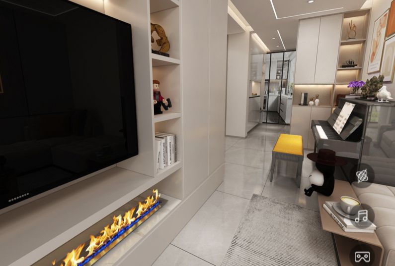 客廳電視墻做了大面積裝飾柜,融合一體,既能裝飾儲物又能看電視,實現(xiàn)多功能一體化,加了一圈的燈光,利用光源,使空間明亮,裝飾效果更強,在這個空間中的使用,不僅反映出現(xiàn)代人追求多姿多彩的居住要求,更迎合了現(xiàn)代簡約設計風格,美觀實用。