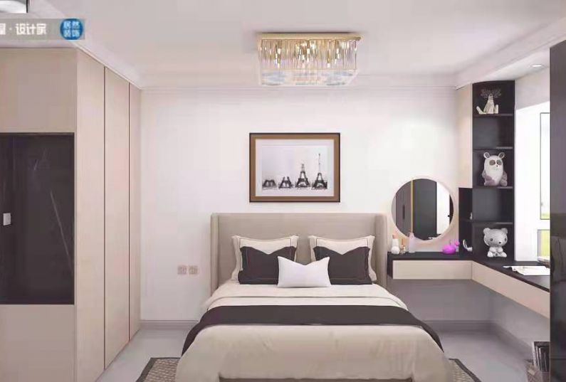 主臥利用飄窗定制了書桌及梳妝臺,還有展示柜,很好了利用空間,使整個空間明亮,舒適。