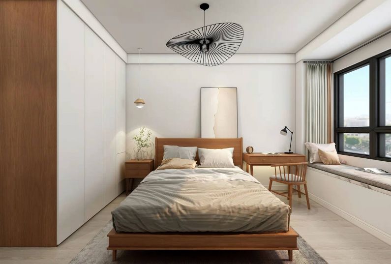 次臥空間榻榻米和整面墻的衣柜和書(shū)柜既滿足了客房功能又補(bǔ)足了收納空間。