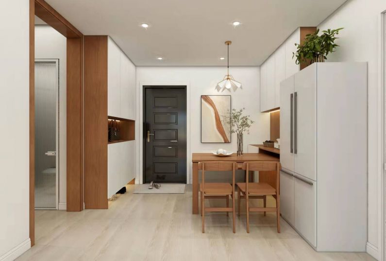 入戶正對(duì)面以半高柜和半玻璃隔斷的形式做了一個(gè)玄關(guān),既解決了一進(jìn)門(mén)一覽無(wú)余的的感覺(jué)又增加了空間的趣味性和裝飾性。