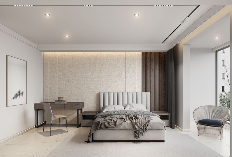 主臥是經(jīng)典的無主燈設計,頂面兩條氛圍燈帶,