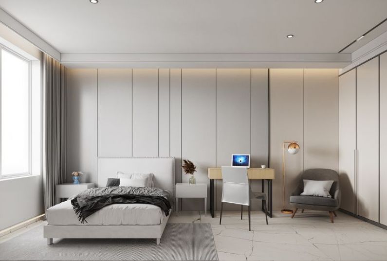 次臥空間搭配了一張單人床,沿用無主燈的設計。