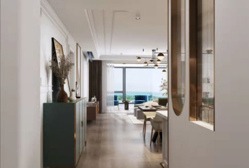 入戶玄關(guān)兩扇造型金屬邊框的長(zhǎng)虹玻璃把采光給到旁邊空間。同時(shí)也提升了入戶的儀式感??筒蛷d空間連貫,墻頂面是北歐風(fēng)格的造型線條。家具燈飾的元素也是配合整體風(fēng)格。