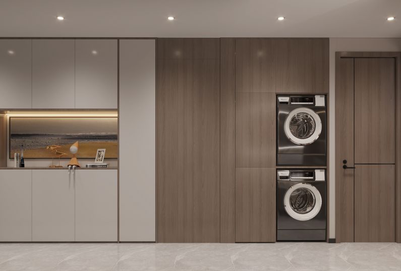 7.借用過道的空間,實現(xiàn)干濕分離。雙臺盆,方便實用,臺上盆,也為干區(qū)顏值加分。洗衣機與烘衣機放置了過道,并將洗衣機旁的柜子用作了家政柜,很好的做了儲物分區(qū)。