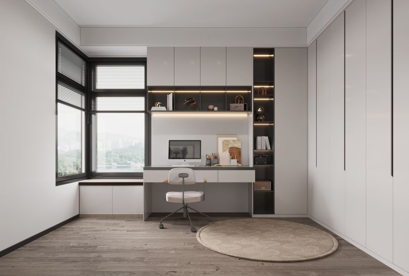 6.書房是業(yè)主平時辦公的地方。如果有親友來訪,拉上窗簾,沙發(fā)床放下就可以變成私密的臥室。一整面柜體,可以歸置超多的衣物書籍等。