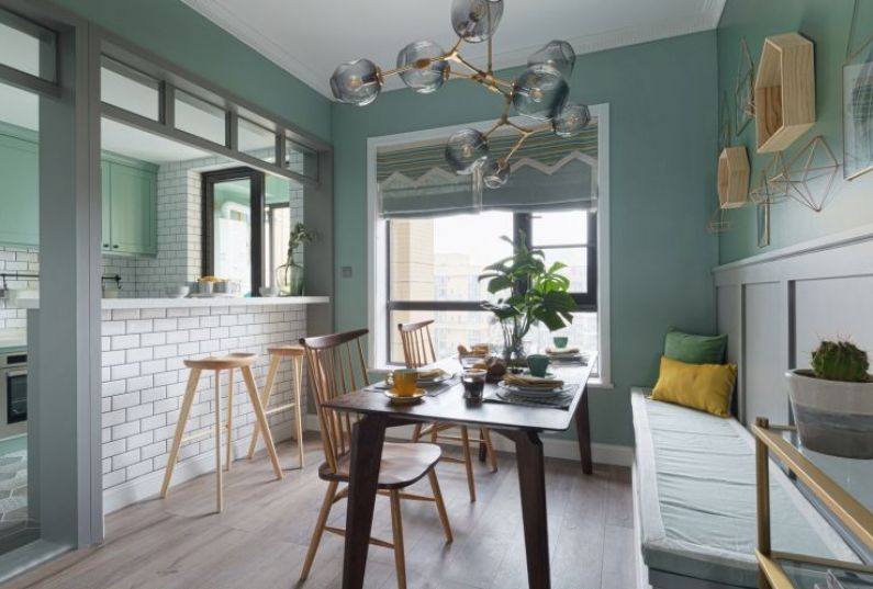 1.門廳餐廳: 利用門廳玄關(guān)柜做過渡,劃分區(qū)域,增加門廳使用功能。圓形吊頂設(shè)計和吊燈是整個餐廳的亮點,加上精致的巖板餐布擺設(shè)跟電視背景墻相互呼應(yīng),增加空間整體感和居住活躍感。