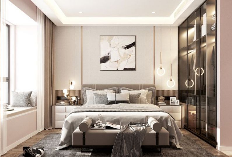 臥室: 臥室軟包奶白色壁布巧裝墻面,胡桃木地板,灰玻質(zhì)感柜門,加上白色的無主燈吊頂設(shè)計,營造出素雅簡約、時尚、個性的氛圍。