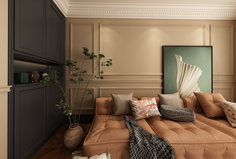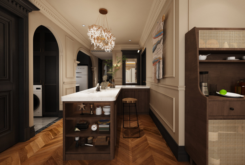美式復(fù)古風(fēng)格的設(shè)計(jì),色調(diào)整體以沉穩(wěn)的咖色調(diào)為主,結(jié)合家具及配飾的亮色,使色調(diào)在沉穩(wěn)中跳脫,不至于顯得沉悶單調(diào)。在遵循美式風(fēng)格的基礎(chǔ)上借鑒其它的古典主義元素,溫馨的暖色調(diào),使得整體家居更加的舒適