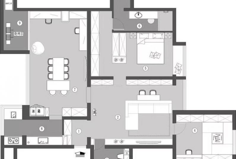 在現(xiàn)場測量后做了一些空間的改造,因?yàn)槭琼攲?,有露臺(tái)(30平米),把原有的露臺(tái)封閉掉改為了餐廳和活動(dòng)區(qū)。