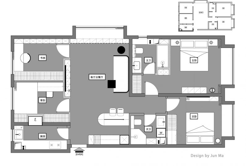 原本戶型客廳的空間就屬于南北通透的戶型空間, 采光充足 ,在不破壞空間整體性的情況下 ,借讓客臥以及書房部分空間, 嵌入電視背景墻, 整體空間的視覺更加整體 ,更顯簡約大氣
