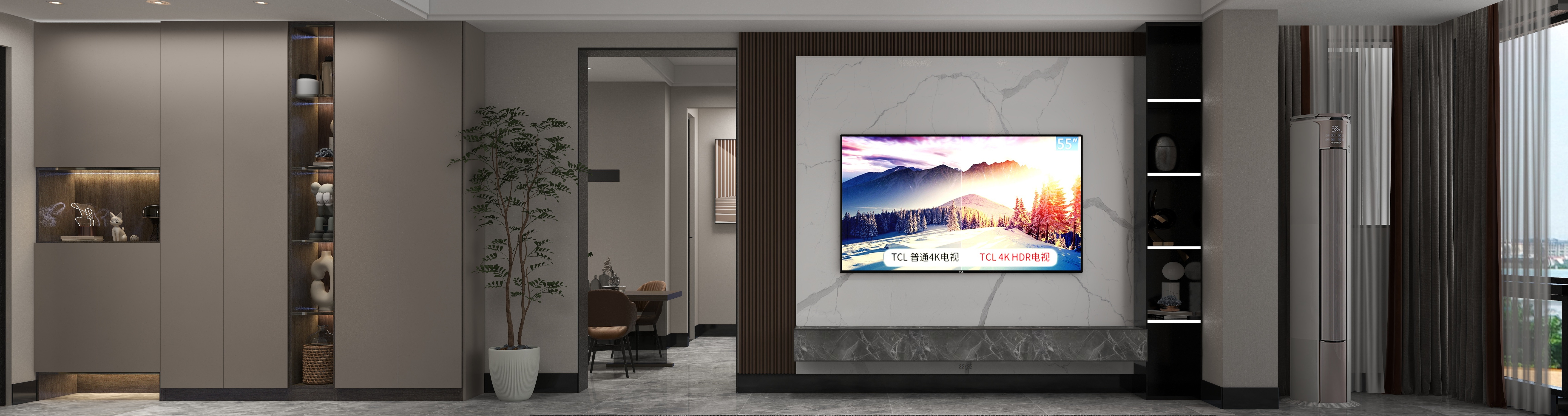 門廳:清新的綠色植被在入門時便可映入眼簾,設計者旨在為回家的人帶來一份舒適感,悠然自在的氛圍油然而生。內(nèi)槽式放臺大大節(jié)省了空間又實用,放入一些好看的裝飾品在悄然增添了空間輕奢氛圍的同時,滿足了收納需求。放臺里溫暖的暖黃色燈與棕木色的木板相互照應,形成光色美景,為冷色系的灰色增添了一絲溫柔,為回家的人增添一份剛回到家時的暖意。