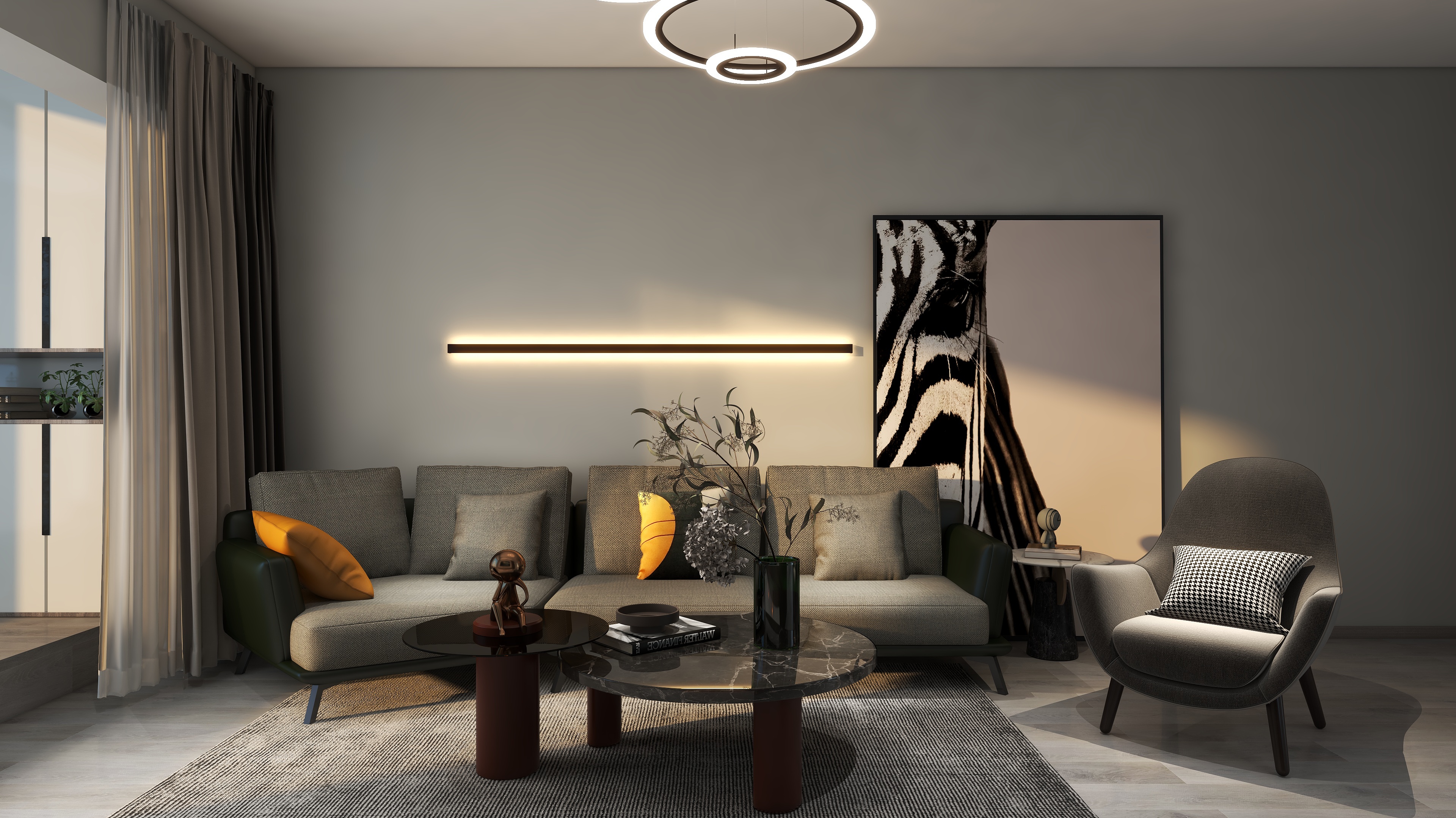 擁有人間煙火的干凈氣息。本案的整體設(shè)計使用黑白灰色系給予了空間理性簡約的基調(diào),黑白灰的碰撞打造出極簡又極具時尚感的空間氛圍。入戶的玄關(guān)柜運用不同材質(zhì)的碰撞堆疊打造立體幾何感,簡單又具有設(shè)計感,實用與美觀相輔相成??蛷d電視墻為了讓整面墻整齊劃一,設(shè)計了隱形門+巖板設(shè)計。用巖板瓷磚上墻做裝飾,點綴了胡桃木格柵板。主臥的設(shè)計延續(xù)空間的整體風(fēng)格,以簡約線條為基調(diào),黑白搭配打造寧靜舒適的休憩空間體驗。空間中線型燈光的設(shè)計給空間加了分。光影如同空間的魔法師,賦予了空間豐富的表情,體現(xiàn)出空間年輕時尚的一面。