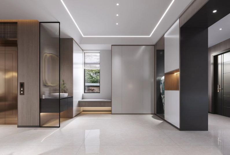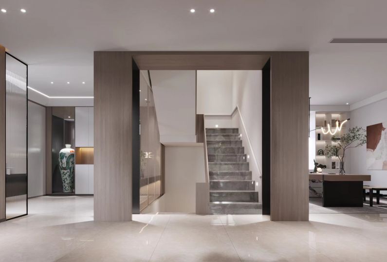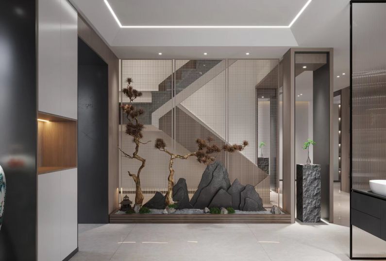 首層門廳集收納與風(fēng)水局為一體,枯山水與屏風(fēng)將樓梯隱于它原本不該凸顯的位置