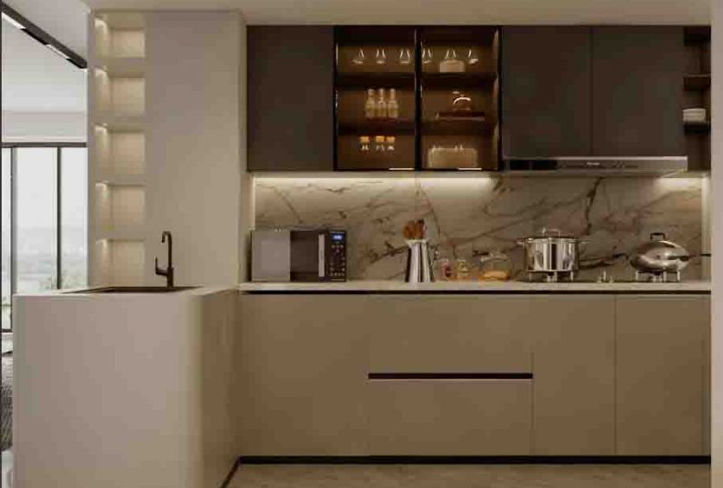 廚房:廚房采用白色為主色的L型的操作臺(tái)設(shè)計(jì),讓整體看起更加干凈清爽,配以黑色嵌入式水槽、黑色嵌入式冰箱和黑色的吊柜,及節(jié)省了空間又增加高級(jí)質(zhì)感,用黃色射燈營造人間煙火氣息。