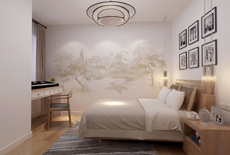 2、 主臥室的床頭背景和頂面處理同樣采用地板,把床圍合在一起,溫馨舒適
