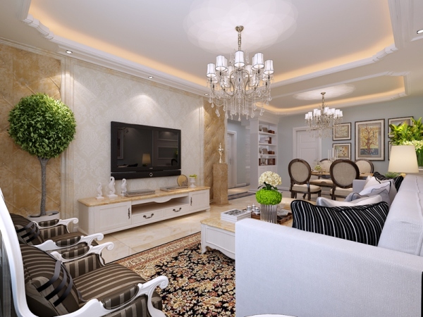 浪漫歐式風(fēng)情空間上則以實(shí)用明亮為主。以白色和米黃色為主調(diào),打造一個(gè)寧靜的空間環(huán)境,水晶燈烘托潔凈明亮的氛圍,綠色點(diǎn)綴,活躍空間氣氛。