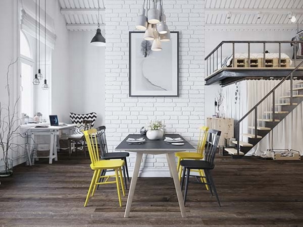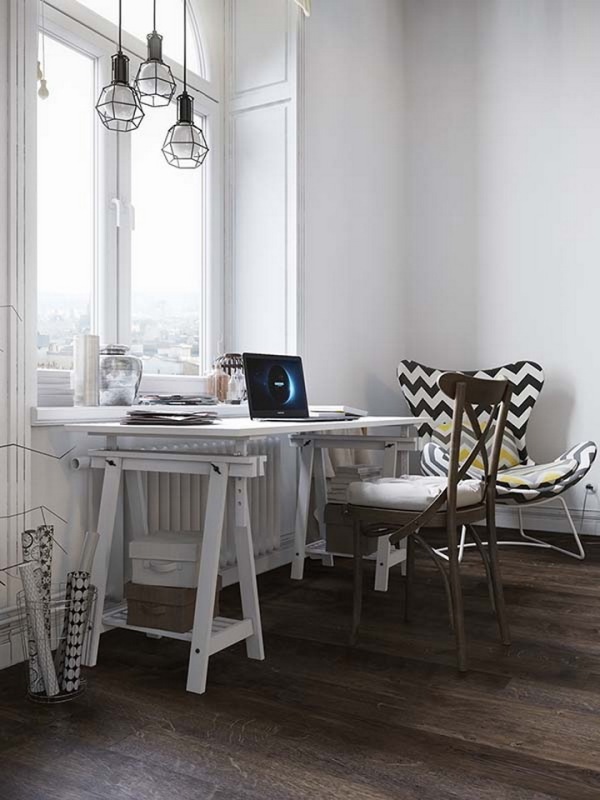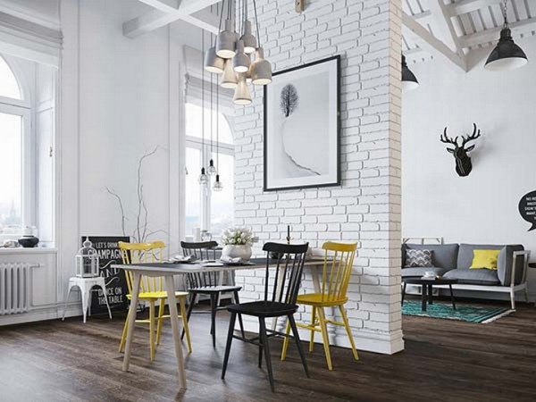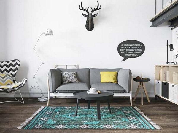 房間整體色彩非常清淡,偶爾的黃色座椅及沙發(fā)靠墊作為色彩點綴,瞬間將空間點亮。起居室沙發(fā)上的鹿頭裝飾是該風(fēng)格典型的特征。靠窗位置的工作臺,工作之余可以遠眺整個城市美景。