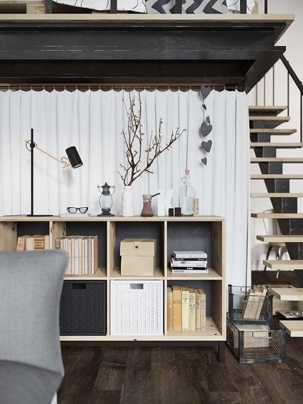 公寓面積不大,主人是一對年輕夫妻,為了盡量節(jié)省空間,沒有單獨的劃分臥室,而是將其放到了局部的二層夾層上,下方用布簾圍合出一處衣帽間及儲藏間。