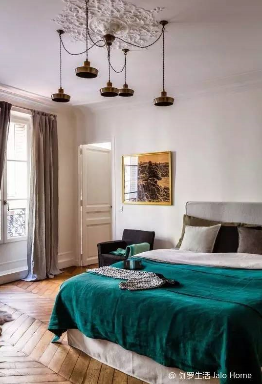 亞麻窗簾、簡約樣式的床和沙發(fā),都屬于現(xiàn)代風(fēng)格的臥室,因為人字拼地板、石膏雕花燈盤、銅燈、床上的絲絨毯而有了復(fù)古的味道。